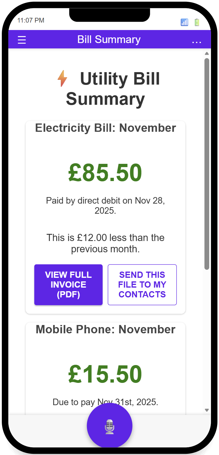 Below is one of early, prototype versions (Nov2025) of miiGenie - a voice‑first assistant that helps seniors manage documents & bills, find trusted local services, while families get simple check‑ins and peace of mind.